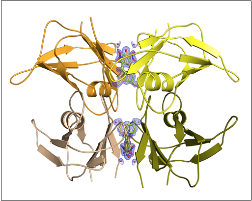 Fig.: Drawing depicting the transthyretin tetramer (TTR) in complex with Tolcalpone (in stick representation with the electron density maps). Based on deposited structure with PDB code 4d7b.