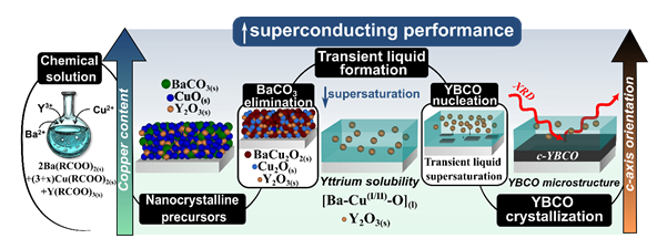 The work now published in Advanced Materials shows the critical role played by the composition of the transient liquid, especially of the Barium and Copper (Ba:Cu) ratio of the Ba-Cu-O oxide, on the nucleation and growth of the epitaxial superconducting YBCO films. The advanced in situ characterization of the growth process using synchrotron X-ray diffraction and coupled to multiparameter nanostructural (Transmission Electron Microscopy) and physical performance investigations has been key to reach high-performance YBCO films. The high-throughput fabrication of YBCO conductors using TLAG will promote the use of HTS materials in large scale power applications such as fusion reactors.