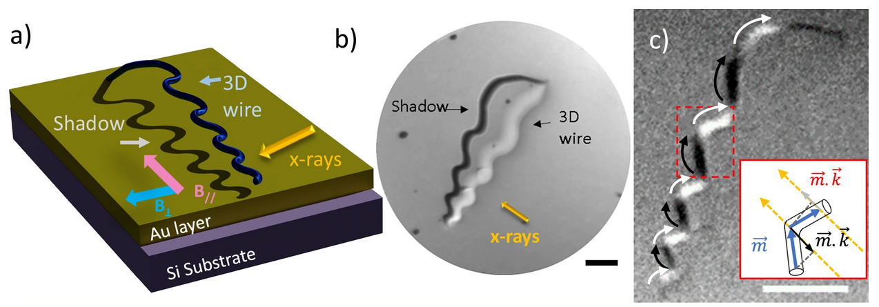 The research team used advanced 3D nanofabrication (focused electron beam induced deposition) to fabricate cobalt nanowires with alternating straight and curved segments. Using X-ray magnetic circular dichroism photoemission electron microscopy (XMCD-PEEM) at the CIRCE beamline of ALBA and at the DEMETER beamline of SOLARIS, they tracked the position and motion of BPDWs under applied magnetic fields. Micromagnetic simulations complemented the measurements, disentangling the effects of curvature on the surrounding magnetic texture from those of the Bloch point singularity itself. The experiments revealed that straight regions consistently pin BPDWs, and that varying curvature sets the height of nearby energy barriers, producing asymmetric potential wells and direction-dependent propagation fields.