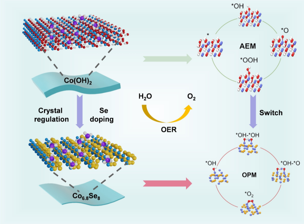 Under working conditions, the catalyst’s surface partially reconstructs into a selenium-doped cobalt hydroxide layer that instead favours the oxide path mechanism (OPM). In this mechanism, oxygen radicals on the surface couple directly to form O₂, bypassing the energy-demanding OOH step.
